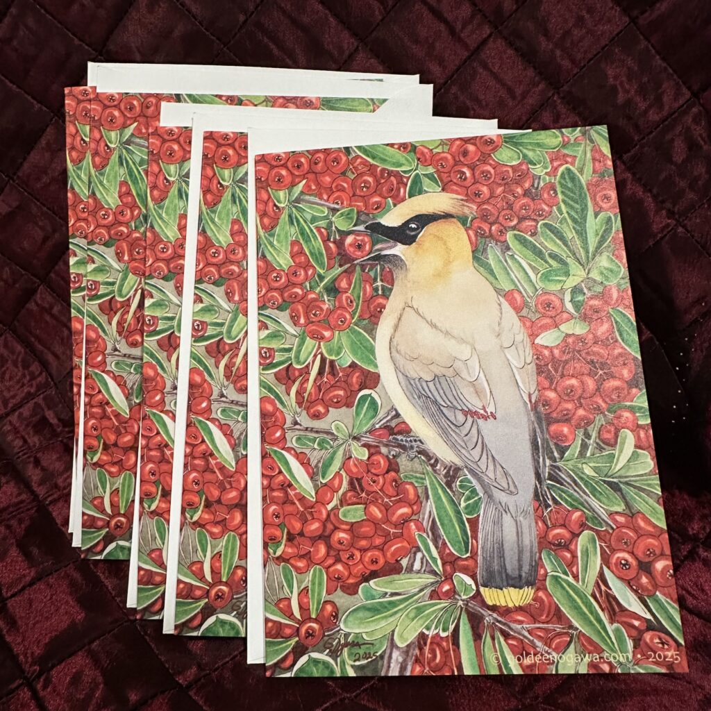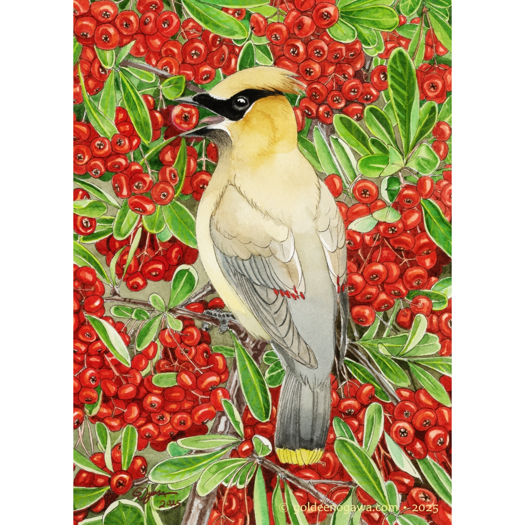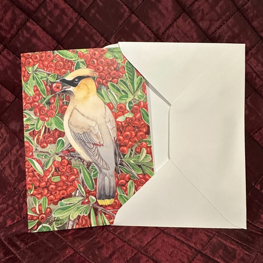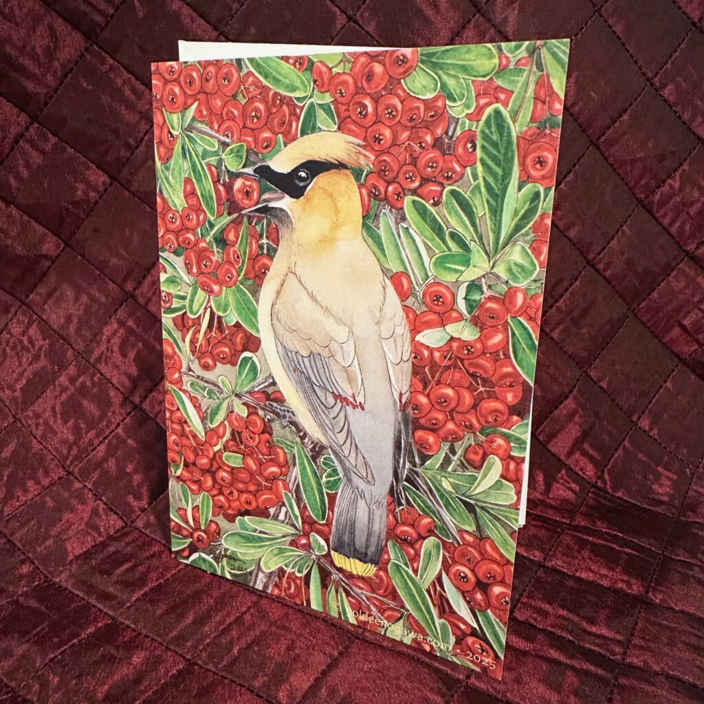 Brighten any holiday season with this cheerful card featuring a cedar waxwing feasting on fat pyracantha berries.