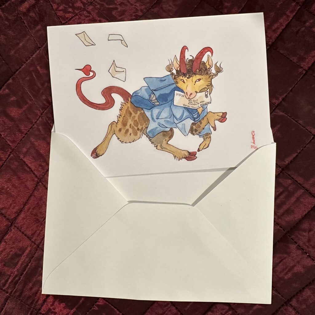 Ever had a letter go astray? Or received a Message Undeliverable return when sending an email? This whimsical card imagines what the Mailer Daemon program might look like in physical form
