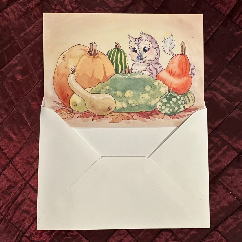 Let Curious Babe deliver your message in this blank-on-the-inside card along with some fabulous gourds!